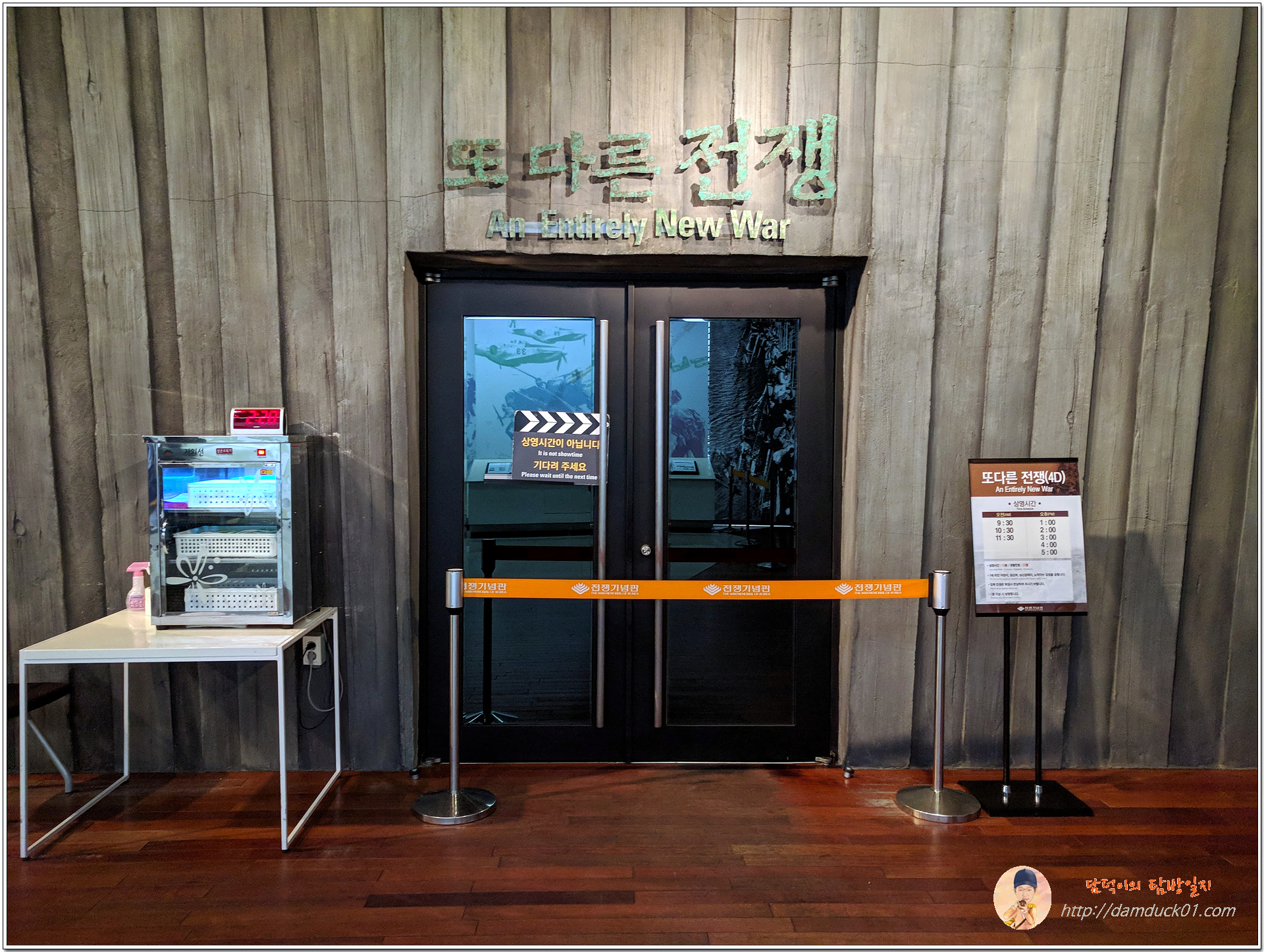 그리고 여기가 6.25 전시실 II관에 있는 4D 실감 영상실인데 아이에게 편하게 볼 수 있도록 하고 싶은 맘에 30여분을 기다렸는데 아주 만족스럽게 관람하다가 여기서 조금 기분이 상했습니다. 원래 그런 건지 이 날 유독 그런 건지 단체 관람객들이 꽤 보였는데 30여분을 기다려서 이미 대기 자석이 만석이 된 상황에서 이제 막 입장을 하려는 시간에 단체관람객들이 오더니 안내하시는 분들이 여기서 관람하고 이동하겠다고 하며 좌석에 상관없이 줄 서는 것도 없이 입장을 시키더라고요.
