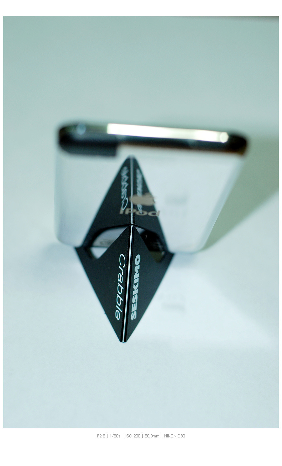 Crabble의 본(?) 모습입니다. 평상시에는 쭈~욱! 펴서 지갑에 넣어가지고 다니다가 사용할 때는 지갑에서 꺼낸 후 살포시 가운데를 접어 주세요. 그럼 위와 같은 모양이 되는데 저 2개의 홈 부분에 원하는 각도가 되도록 거치시키면 끝입니다. 물론 어느 정도의 각은 양다리를 오므렸다, 벌렸다 하시면 조절이 됩니다.