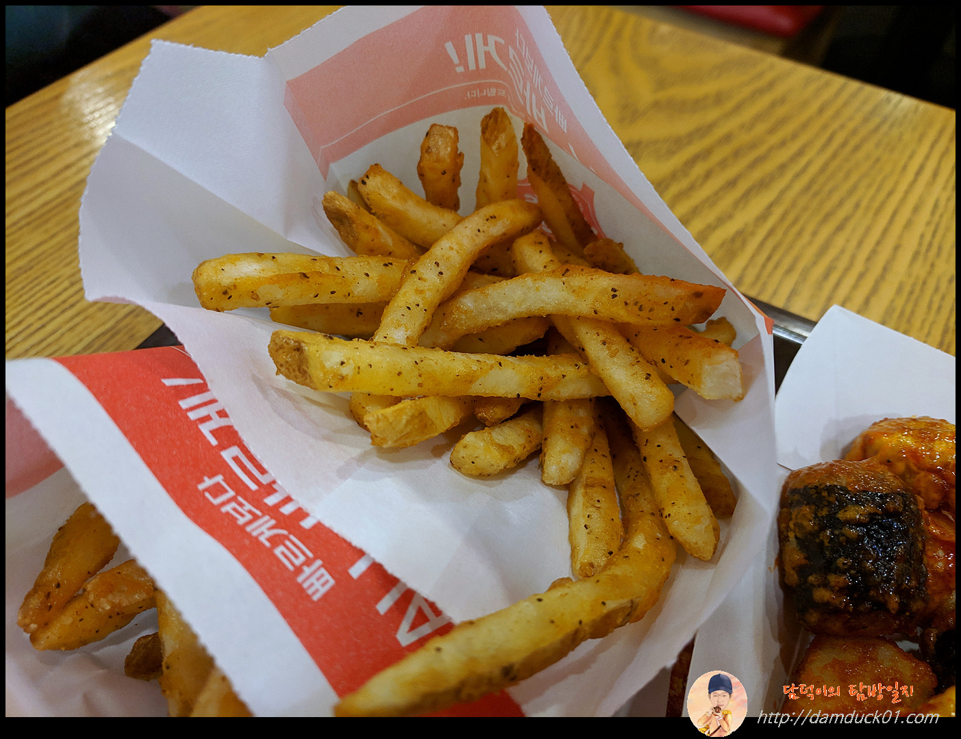 먼저 감자튀김을 좀 보면 맘스터치의 감자튀김(클릭하시면 사진을 볼 수 있어요.)과 비교하면 그냥 평범하죠.
